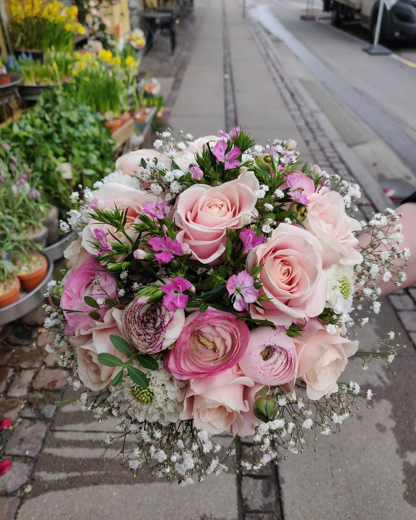 Buketten laves ud fra seasons blomster, og med et vildt udtryk der passer til vesterbros stil. Derfor vil de afvige fra billedet, men vi vil altid bestræbe på matche så meget som muligt. I altid velkomne til at ringe til os og høre hvilke blomster der er på lager.